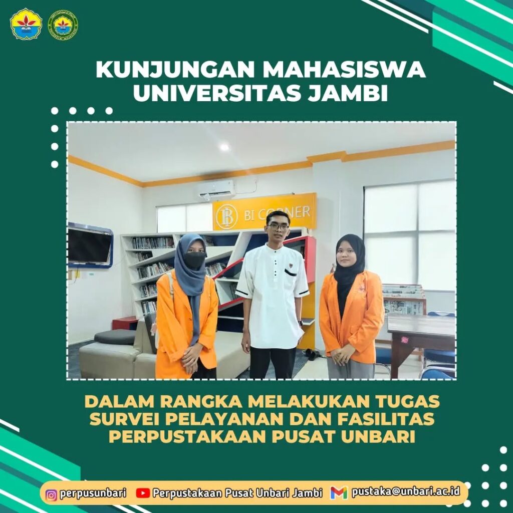 Mahasiswa dari Universitas Jambi (UNJA) baru-baru ini melaksanakan kunjungan kerja ke Perpustakaan Pusat Universitas Batanghari (UNBARI) Jambi. Kunjungan ini merupakan bagian dari tugas yang diemban oleh para mahasiswa, yaitu untuk melakukan survei komprehensif mengenai pelayanan dan fasilitas yang tersedia di Perpustakaan Pusat UNBARI.